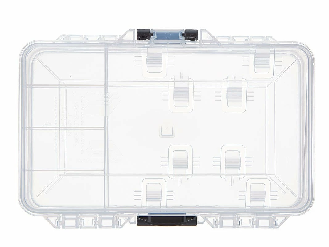 The Plano Worm StowAway 3600 is a specialized stowaway container designed specifically for holding bags of soft plastic worms and soft plastic stickbaits. It can comfortably hold up to 8 normal-sized bags of plastic bait (e.g., your typical size Z-Man, Gary Yamamoto, KVD Perfect Plastics, etc bags of soft bait) and employs a dual-sided StowAway design with transparent clear plastic construction. The box also has 4 shallow fixed compartments designed for holding terminal tackle and a deep compartment for scents, pliers, or other tools.