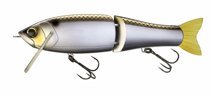 The Duel Hardcore Ninja Swimmer 180F 7 inch is a flat-sided, single-jointed Japanese glide bait that slips through the water with a wide “S” action. This lure is super slow sinking with a slight head down position on the fall for optimum presentation. When using a twitch style retrieve it produces a 180 degree darting action. The Ninja Twitch’n Glider features high quality black nickel Japanese treble hooks and includes an extra replacement tail. The joint is double-hinged with a stainless steel pin to make sure you keep hold of those double digit bass of a lifetime.