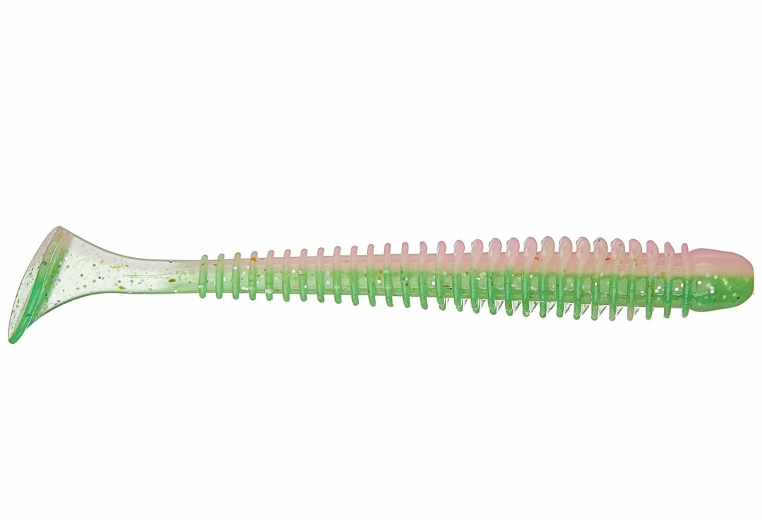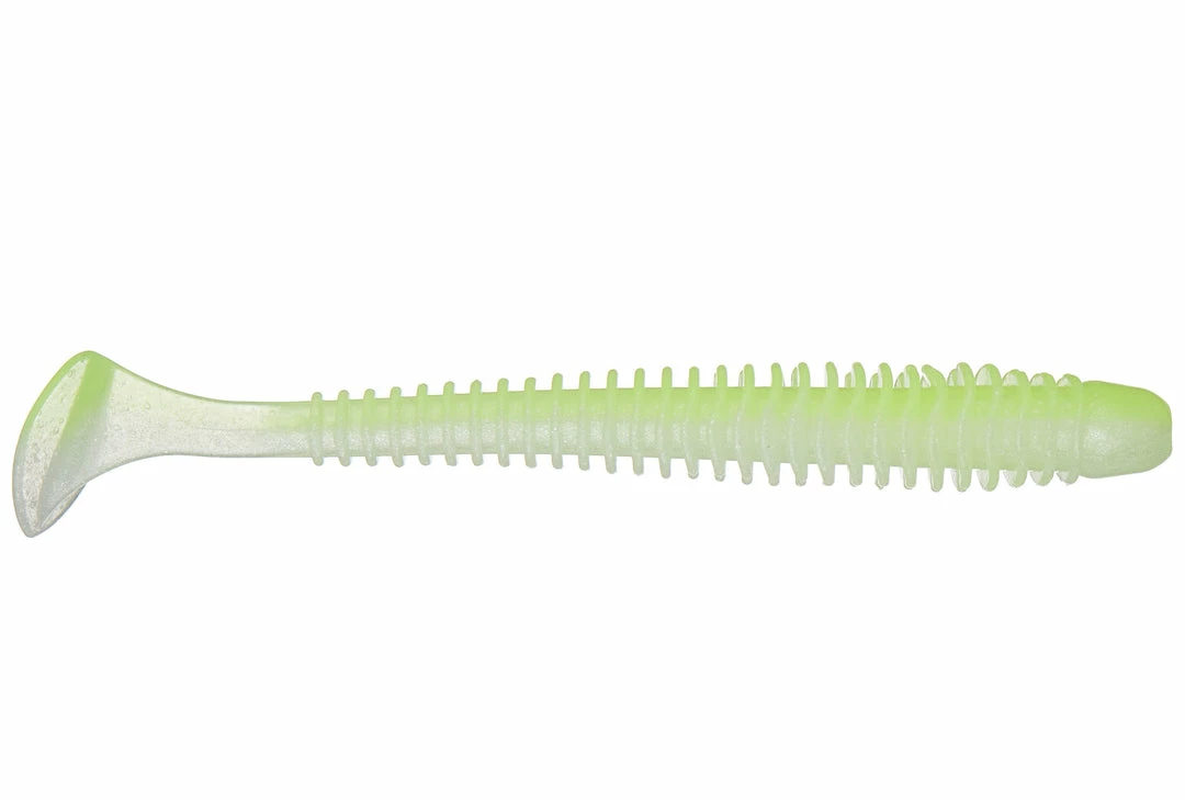 - The Keitech Swing Impact Saltwater 4 inch soft plastic ribbed paddle tail swimbait.