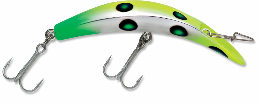 The Luhr-Jensen Rattling Kwikfish K15 are 5 inch diving plug lures designed for salmon, steelhead, and lake trout. Kwikfish are full-throttle, wide-action, leave-no-doubt lures that challenge game fish small and large alike. Their aggressive action forces a response from fish, often generating the most savage strikes imaginable. This size is great for middle range steelhead and silver salmon and smaller king salmon and lake trout. For maximum success, tune the screw eye on the face of the plug to achieve an even side-to-side action. Using small adjustments, turn the screw eye in the opposite direction that the lure is favoring, until it tracks straight. The Rattling Kwikfish K15 is rigged with size 2/0 treble hooks and dives unassisted to 15 to 17 feet deep.