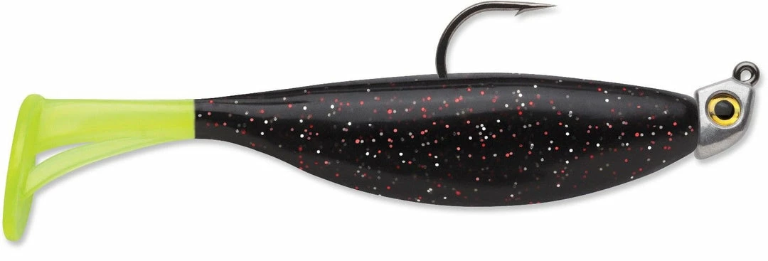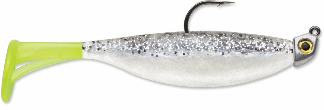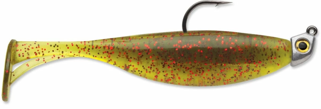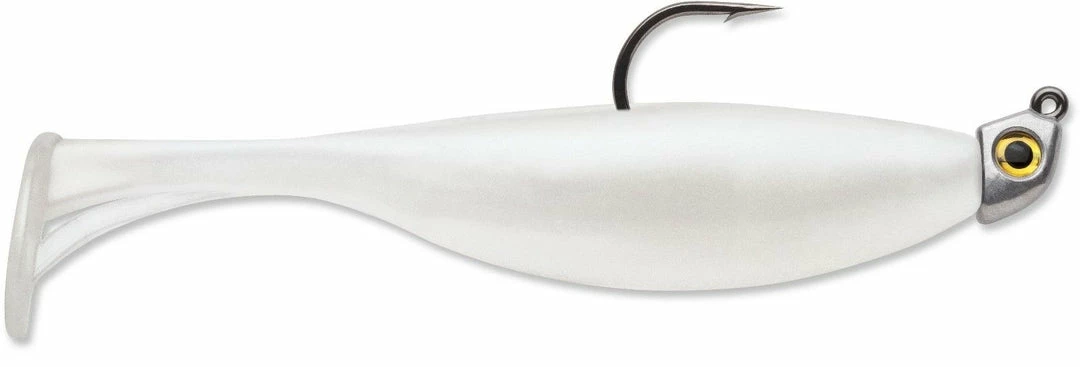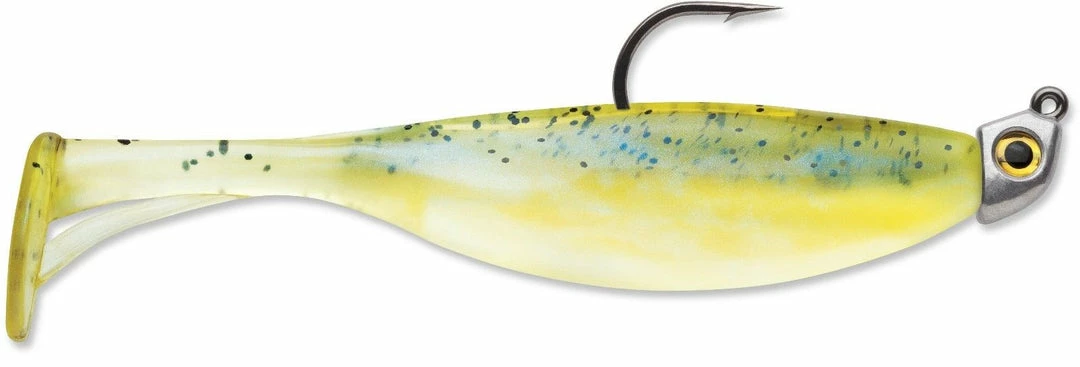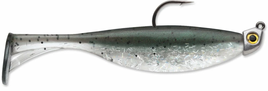 The Storm 360GT Largo Shad w/ Jig is a pre-rigged, shad profile soft plastic swimbait. This bait features swimming action with a slow body roll and exaggerated tail swing and can be customized by cutting or removing the “tail tendon” for a wider tail action. It swims on both retrieve and free fall and includes belly and back slots for easy rigging and maximum hook gap. The universal baitfish appeal makes this a “go-to” lure for any inshore or bass applications, and will trigger strikes from a wide variety of species. It’s pre-rigged with with a jig head with a VMC Coastal Black Hook and 3D Holographic Eyes. Available in 2 sizes (3 inch, 1/8 ounce jig and 4 inch, 1/4 ounce jig) and 18 colors suitable for fresh-, brackish, or saltwater applications. Each pack comes with 1 body pre-rigged with hook and 3 extra swimbait bodies (4 bodies and 1 jig total).