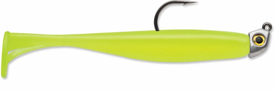 The Storm 360GT Mangrove Minnow w/ Jig is a pre-rigged soft plastic swimbait designed to imitate mangrove minnows for inshore fishing. It’s molded to have an irresistible swimming movement on retrieve and fall with a tight body roll and quick paddling cadence. In addition, the tail offers the option to cut or remove the “tail tendon” for a wider tail action. Also features belly and back slots for easy rigging and maximum hook gap and a pre-rigged swimbait jig head with a VMC Coastal Black Hook and 3D Holographic eyes. Available in 2 sizes (3 inch and 4 inch) and 18 colors suitable for fresh-, brackish, or saltwater applications. Each pack comes with one body pre-rigged with a jig head and 3 extra swimbait bodies (4 bodies and 1 jig head total).