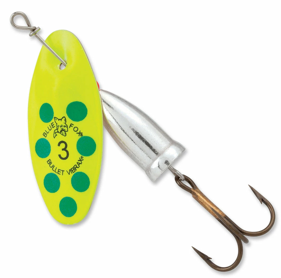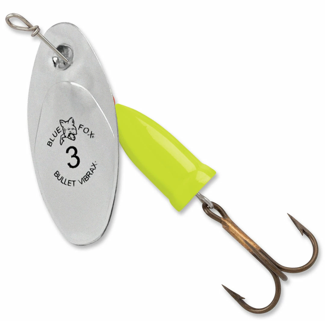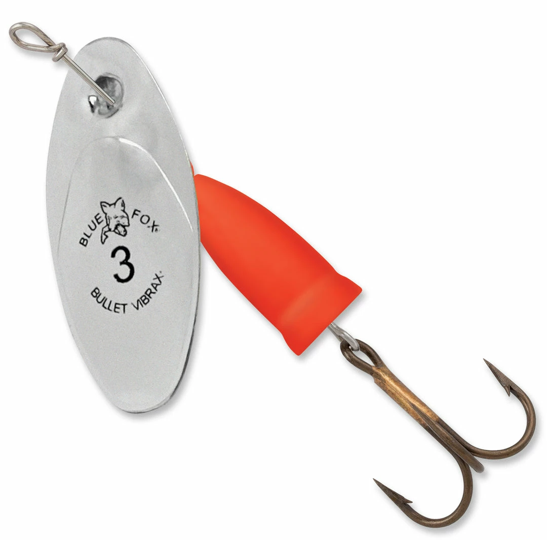 - Blue Fox Vibrax Bullet is a heavier variation of the classic Vibrax inline spinner series designed for faster current or deeper water when maximum vibration is needed.
