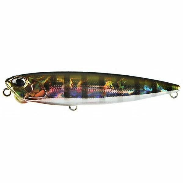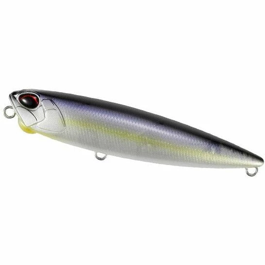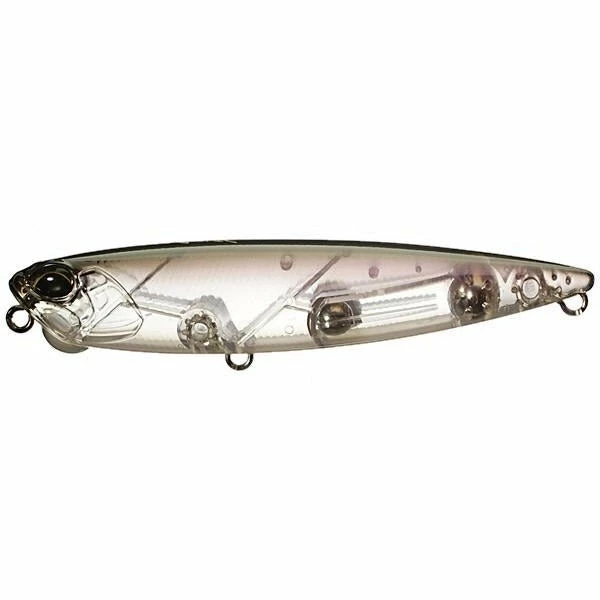 The DUO Realis Pencil 110 sets a standard for all walking baits. The reinforced, thin wall construction aids the creating more internal volume to the body cavity. The consequence is excellent durability, high buoyancy and a further acoustic range. At first glance, the Pencil 110 looks round and linear like other walking baits but closer examination reveals the body shape is oval with flat areas giving it superior aero dynamics for its size. The intelligently designed ballast system not only gives the lure superior casting range, it provides additional services. It has a dual weight configuration. One weight is fixed and the other is positioned to move on a track. This gives the lure a superior tacking action. “Tacking” is the side to sidetracking cadence also known as “walking the dog”. The impact of the weights also creates an amplified dual tone. This high pitch can be heard from extreme distances giving the lure more calling power. The innovative Pencil 110 provides an angler with the ability to reach his target in a single cast, immediately initiate walking-action, and “call” the fish from greater distances.