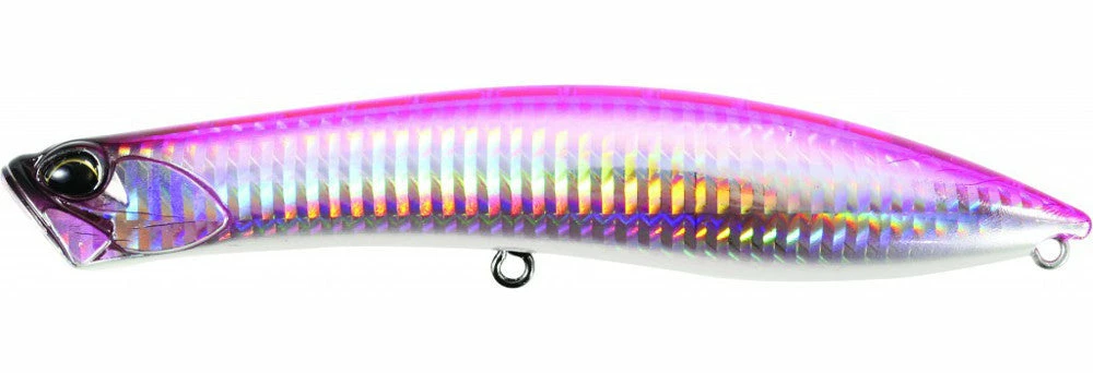The swim actions of the DUO Realis Pencil Popper 110SW are effortless, the sound resonates well, the profiles are attractive and the color patterns are proven. You will notice close up its shape, the bends and curves and tapered points all pertain to engineering keys that unlock their aerodynamics and hydrodynamic functions which will pleasantly surprise you. The internal super-structure adjoins over 40 intersecting diagonal beams creating super rigid body core. DUO’s molding technology is one of the most advanced in the world, giving this company the sole ability to create a super structure designed to withstand bone-crushing encounters with giant game fish. The front hook harness utilizes a 360-degree rotation swivel, which helps reduce negative leveraging by the fish against the hook and body. The popper`s mouth enters the water line at approximately a 45-degee angle allowing the lure to displace a significant amount of surface-water.
