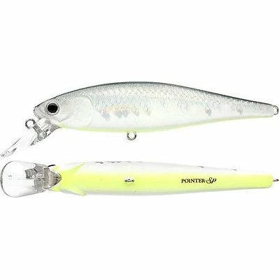 The POINTER has been designed with a very low center of gravity through the use of special brass weights. The low center of balance causes the lure to wobble and vibrate whenever the retrieving motion is stopped. The POINTER suspends and will emit an intriguing bass-calling vibration, while in the suspended state. A short twitch of the fishing rod will generate the “Walk the Dog” action under the water.