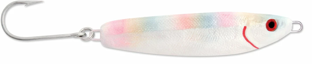 In combination with a fish finder, the lure can be targeted precisely in vertical jigging applications. Fish the Crippled Herring vertically, with a slow, long upward motion of the rod tip followed by a fast drop of the tip. The lure will most often be taken on the downward fall. Pay attention for taps and hesitations on the fall and set the hook when they happen. In cold water conditions, pause at the bottom of the drop for up to three seconds to connect with lethargic fish. In addition to the pre-rigged inline single, the 1/2 ounce through 1-1/2 ounce sizes include an optional VMC treble hook. While the 2 ounce and up sizes include an option siwash hook. The Luhr-Jensen Crippled Herring is offered in sizes ranging from 1/2 ounce to 5 ounce and is available in wide range of colors and metal finishes.