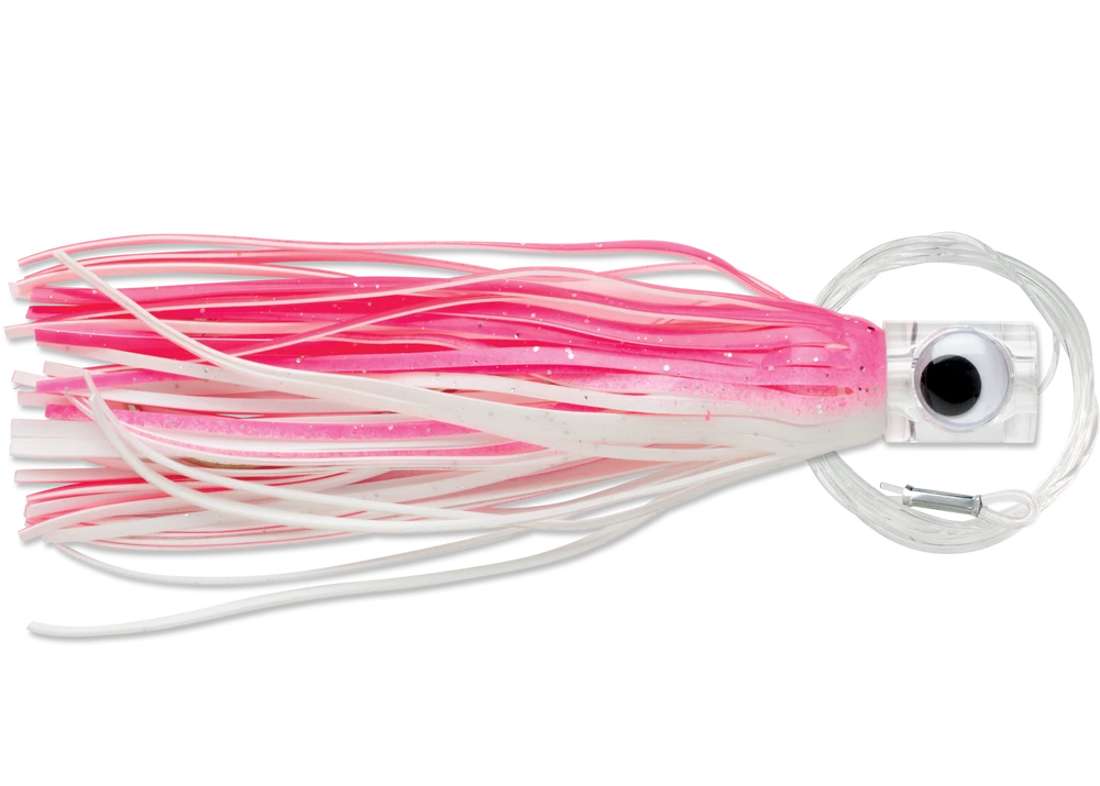 The Williamson Rigged Dorado Catcher is a skirted trolling jig optimized for dorado fishing (aka mahi-mahi, dolphin, or dolphinfish) Thanks to the large cavity in the rear of the head of this flat-faced pusher, the Williamson Rigged Dorado Catcher fits perfectly with a ballyhoo rigging spring. This allows the bait close enough to the head and skirt for more control and protection at any trolling speed. This great dolphinfish and sailfish bait is equipped with a Sufix Mono Leader (5 ft. – 60 lb. for the 4 1/2 inch size (DCR4); 5 ft. – 130 lb. for the 6 inch size (DCR6)) and a VMC Perma Steel Hook (Size 4/0 for the 4 1/2 inch size (DCR4); Size 8/0 for the 6 inch size (DCR6)). The Williamson Rigged Dorado Catcher is available in 8 colors and 2 sizes.