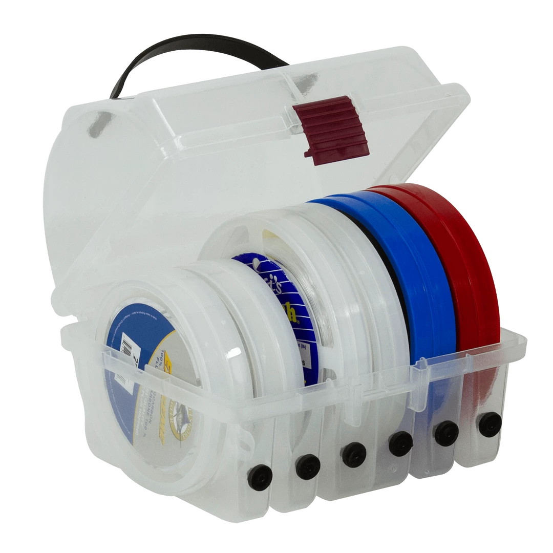 The Plano Leader Spool Box is a clear plastic storage box specifically designed to hold wheels and small spools of leader material. Anglers will appreciate how the Leader Spool Box provides them with a simple and convenient way to store and organize their leader spools. The item can handle storing up to six spools that are 5 inches in diameter and 1-inch wide. In addition, the Leader Spool Box has rubber-line guides that can feed through for direct access while the spools are being stowed. The product comes with a ProLatch closing system and an easy-to-carry handle.
