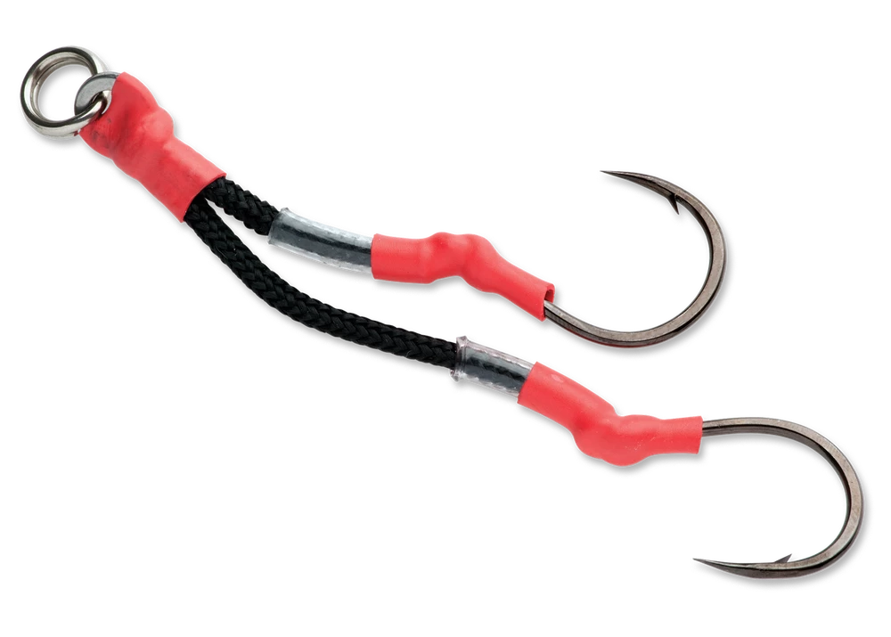 For flawless hook-ups while blue water jigging, make sure to rig your vertical deep drop jigs with Williamson Tandem Assist Hooks. Composed of two jigging assist hooks pointing at opposite directions, constructed from a durable black nickel alloy, and connected via Dacron. Design ensures the fish which bit cannot use the weight of the hook as leverage to throw it off. It also features a protection tubing to prevent chafing. Top rigging of the hooks helps prevent snags on bottom vegetation, reefs, or wrecks. The Williamson Tandem Assist Hooks are available in 3 sizes.